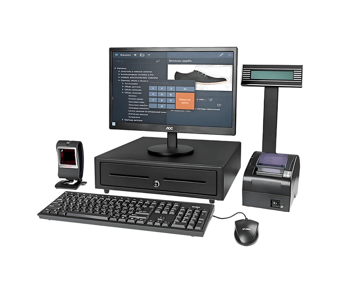 Максимально производительный комплект на основе неттопа и офисного монитора в комплекте с надежным фискальным регистратором АТОЛ FPrint‑22ПТК, денежным ящиком и периферийными устройствами